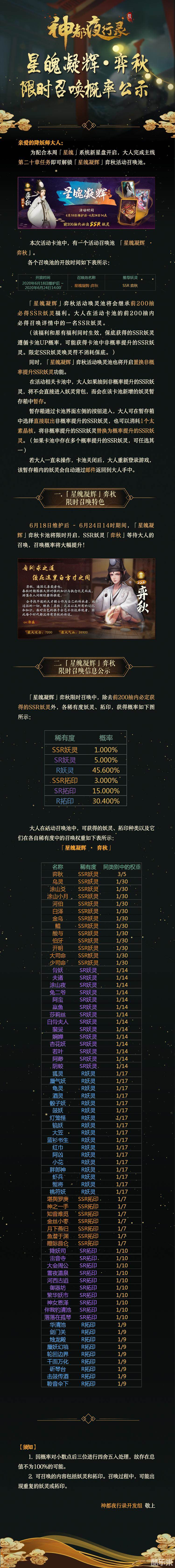 《神都夜行录》6月19日 星魄凝辉·弈秋 限时召唤概率公示