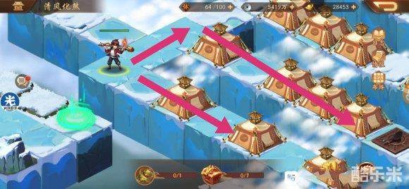 开始副本,踩指南针,此刻主角所在路线为一号,隔壁二号,按照楼主所指示箭头,第一条路通关,打开指南针,回头第二条路以此类推,推图到头,打开指南针