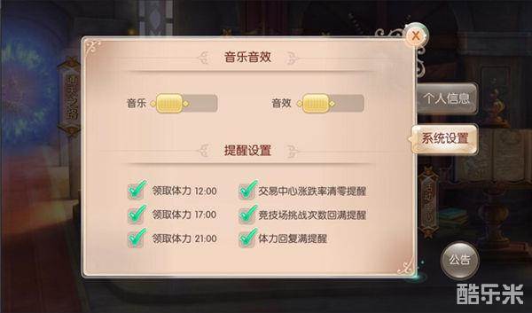 最后给大家讲讲游戏里的系统设置,这个很多游戏都会简化的设置,在《神谕大陆》中也是做得非常细致。除了简单的音效设置外,还有体力领取、交易中心涨跌率、竞技场次数和体力回满的提醒设置。根据不同玩家的游戏习惯来变更提醒设置,让喜欢《神谕大陆》的你拥有更好的游戏体验!