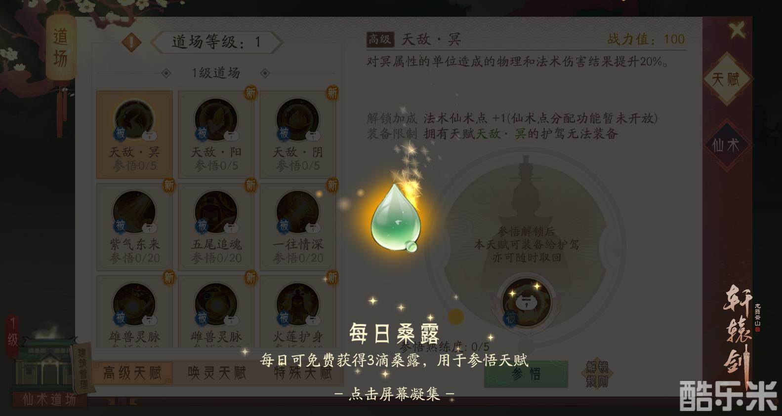侠士们可每日免费领取“桑露”道具进行修炼。选择指定的天赋技能进行参悟,解锁后的技能可装配给其他护驾使用。“仙术道场”将为技能提供繁多的搭配可能,给战斗创造多样的策略选择!