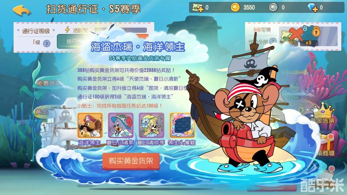 此外,升级为黄金货架,通行证等级达到100级时,即可解锁S5限定赛季货架皮肤“海盗杰瑞·海洋领主”,全新技术震撼特效,为猫鼠追逐带来夏日的清爽海风!