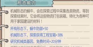 机械形态的能力是在探索的过程中可以采集各类物资,在探索结束的时候可以将采集的物资转化为家园建设的各种材料,并且还可以提高工程宝箱的获得机率。玩家可以使用机械形态去探索美国地图,有更高的收益。
