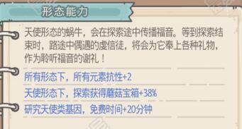 天使形态的能力是在探索的过程中可以传播福音,在探索结束的时候会有虔诚的信徒的跟谁,这些信徒会给蜗牛很多的礼物,礼物就包括了贵重物品等等。并且在探索的过程中可以提高蘑菇宝箱的获得概率。