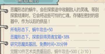 恶魔形态的蜗牛是主要增强了蜗牛的攻击力和防御力,并且是前期最主要的形态使用,玩家在前期战斗的时候需要的正式攻击力和防御力,并且在前期资源少的时候,使恶魔形态加成的恶魔细胞更加容易获得。