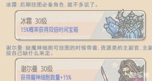 冰霜是后期挂机的必备英雄,可以有15%的概率获得双倍时间的宝箱。