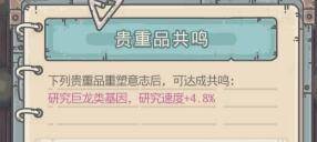 这四个贵重物品组合在一起的共鸣效果是可以在研究巨龙类基因的时候,加速研究的速度。这个对于玩家在中后期的成长来说是很重要的,并且巨龙基因是没有特殊细胞的。
