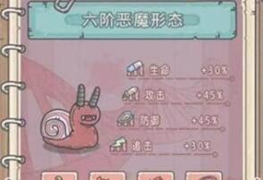 2、属性变化恶魔1阶(恶魔)蜗牛生命+10%、蜗牛攻击+20%、蜗牛防御+20%、蜗牛追击+10%、恶魔形态下,探索获得灵魂宝箱+10%。