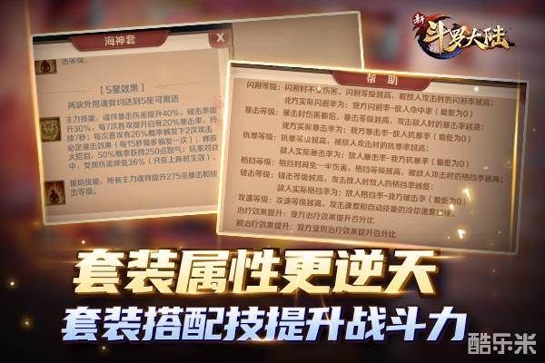 以海神八翼能够组成的套装效果为例,将海神八翼的上翼和下翼同时提升到5星后,激活的主力技能甚至有多达5种技能效果:提升穿戴魂师的暴击率、暴击伤害、破击率、概率在魂师释放大招后返还部分怒气,并且还有强大的减少受到伤害效果。