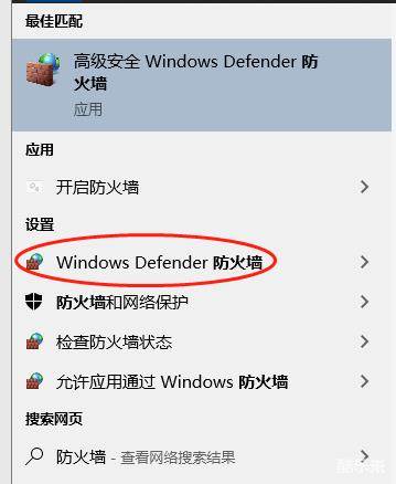 关闭windows防火墙,在windows搜索框中搜索“防火墙”选择“Windows Defender防火墙”点击进入。