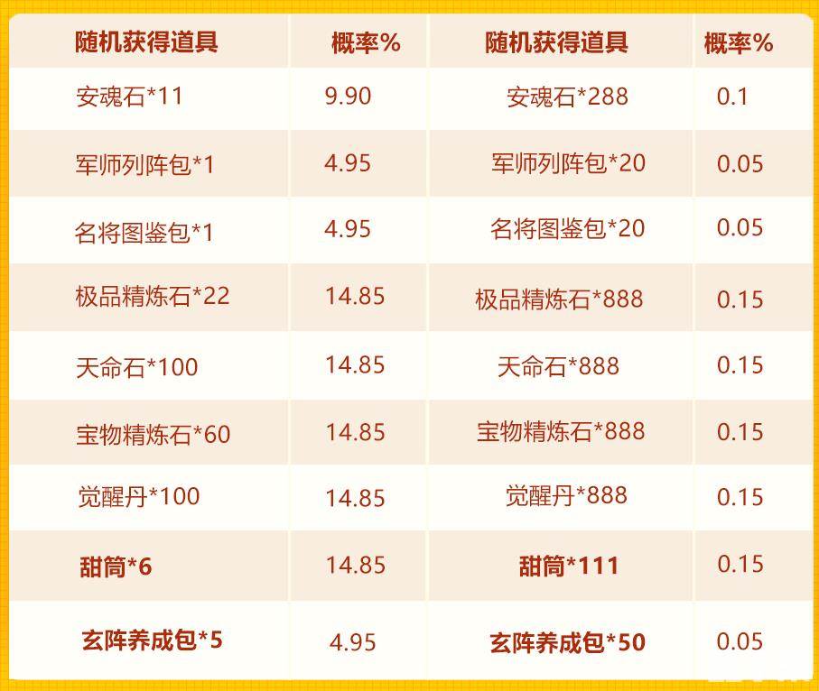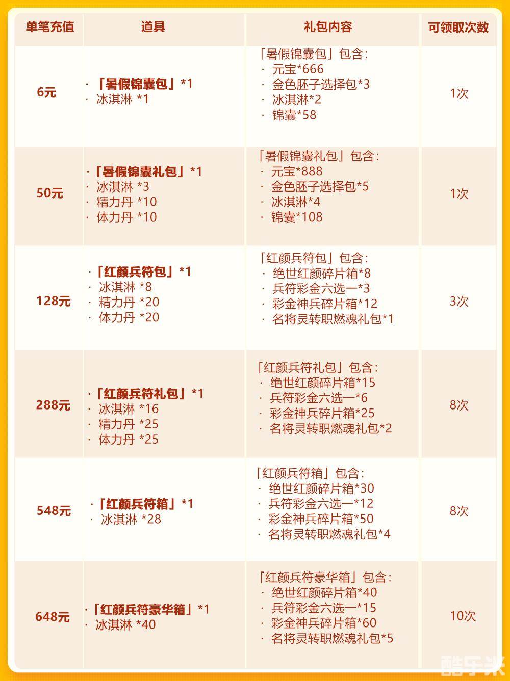3.「暑期礼盒」可开出:甜筒*111、玄阵养成包*50、觉醒丹*888、天命石*888、极品精炼石*888、安魂石*666、军师列阵包*40、名将图鉴包*40、宝物精炼石*888、甜筒*6、玄阵养成包*5、觉醒丹*100、天命石*100、极品精炼石*22、安魂石*11、军师列阵包*1、名将图鉴包*1、宝物精炼石*60中的随机1种。