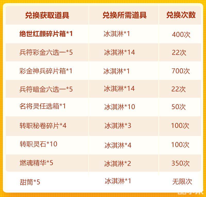 「冰淇淋」可用来兑换绝世红颜碎片箱、兵符彩金六选一、彩金神兵碎片箱、兵符暗金六选一等稀有资源: