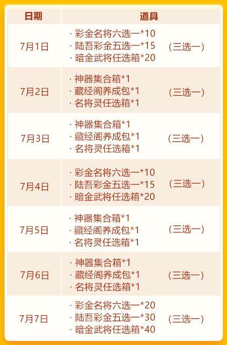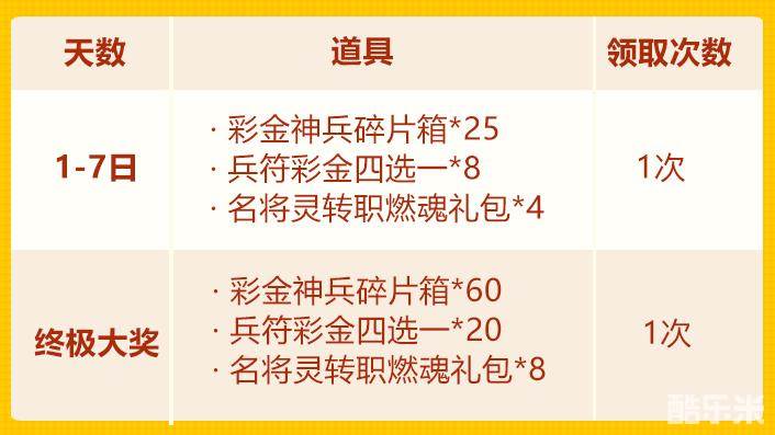 1-7日可领取:「彩金神兵碎片箱」*25 或 「兵符彩金四选一」*8或「名将灵转职燃魂礼包」*4