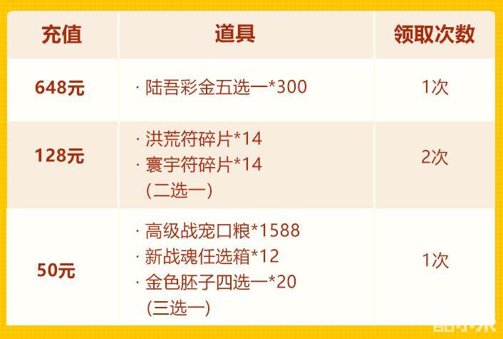 少年们单笔充值指定金额,即可得到陆吾彩金五选一、洪荒符碎片、寰宇符碎片等资源!少年们千万不要错过哟~