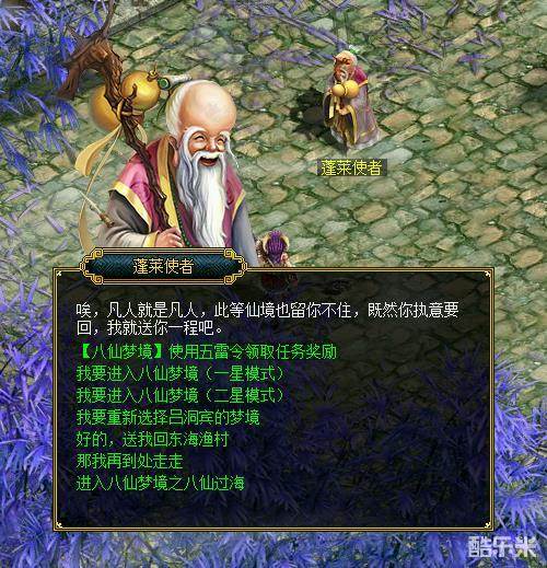 当玩家等级大于60之后,即可前往蓬莱岛上的蓬莱使者处,领取当天的“八仙梦境”系列任务,八仙梦境副本中共有九个梦境,领取到谁的梦境,就需要找到相对应的NPC进入梦境。梦境将按照吕洞宾,韩湘子,何仙姑等顺序依次领取,如玩家第一天领取的任务为吕洞宾的梦境,则第二天就可以领取韩湘子的梦境任务。