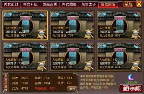 注2:每个各院秀女总等级相差不超过100级(每相差100级平衡度减10,一直减到没有)才能平衡系数100%哦!