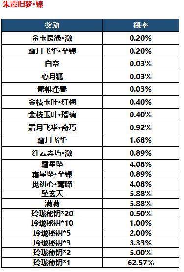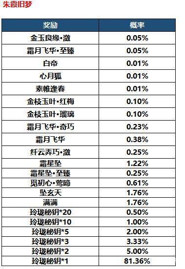 《剑侠世界2》手游【朱霞旧梦】奖池概率如下:
