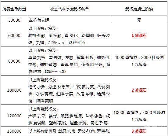 1、活动期间,累计消费金币数量达到对应金额,可以联系在线客服申请1个排行榜武将奖励,或对应金额的进阶酒或橙源石奖励;
