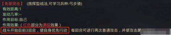 ·先前的【先驱突击】是前两回合获得先手和连击,前段时间迎来的增强,使得【先驱突击】这一五星战法的用法也更加广阔了。
