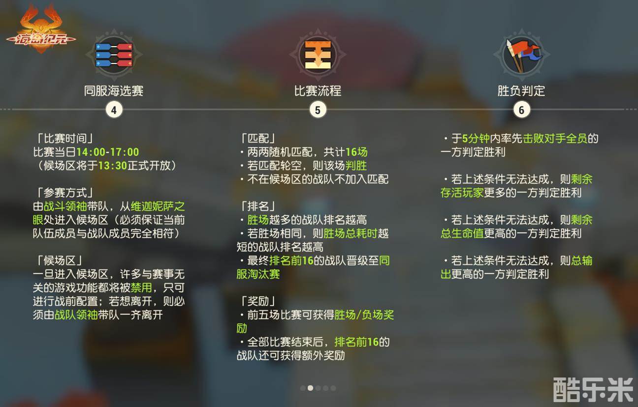 等待海民勇士的第一关便是【同服海选赛】,在比赛过程中,五分钟内率先击败敌方全员的战队即可获得胜利,最终排名前16的战队将晋级至【同服淘汰赛】。
