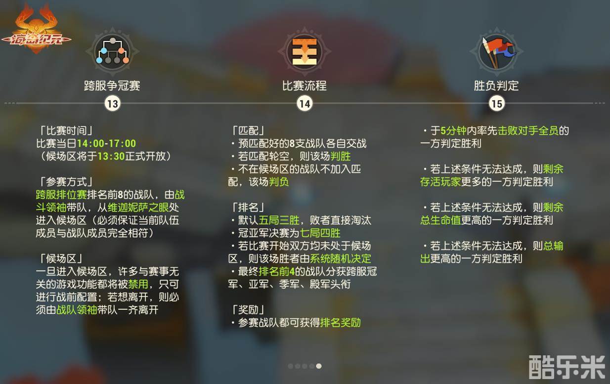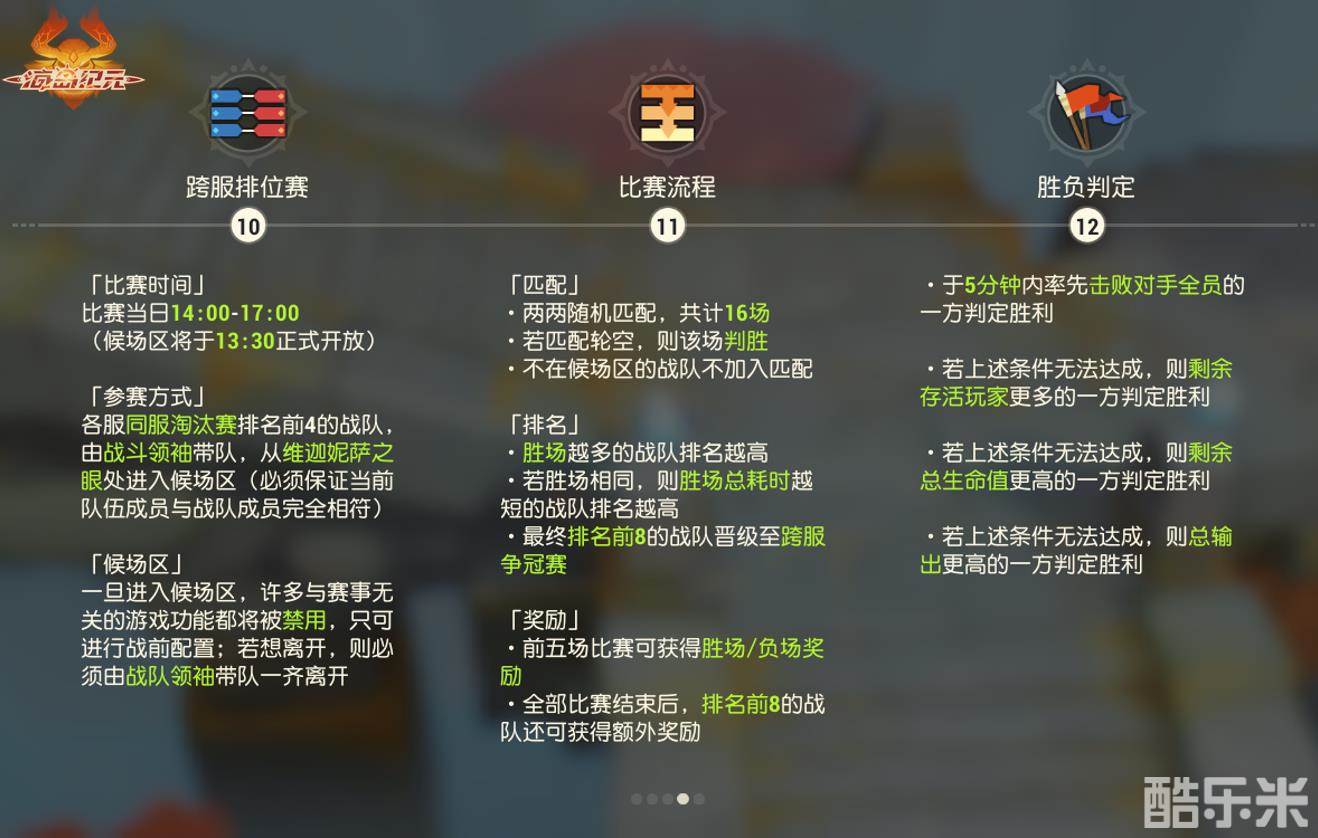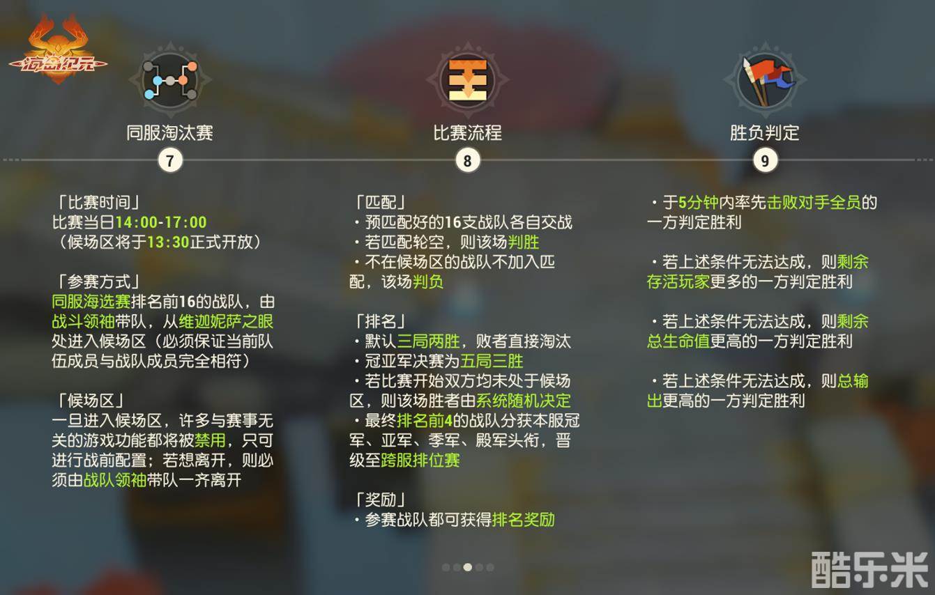 激爽战斗,酣畅一夏!预匹配好的16支战队进入【同服淘汰赛】后,便可各显神通,享受超燃对决。本轮比赛采取三局两胜制决出胜负,败者直接淘汰出局。经过厮杀对决后,留到最后的两支队伍将以五局三胜制决定冠、亚军归属。最终排名前4的战队分别获得本服的冠军、亚军、季军、殿军头衔,而后晋级到【跨服排位赛】。