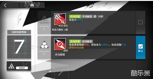 我们可以看到,满级的白金有着570点的高额物理攻击,我们再看她的技能,没错,这个白金的天马视域也是真正意义上的专精三满级,只需要50点的SP就能够将攻击力翻倍成1140点,同时还具有比普通狙击更远一格的攻击距离!