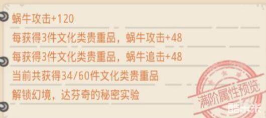 达芬奇手稿是一个三s的橙色的贵重物品,效果很明显,在贵重物品满级之后,玩家可以获得120点的蜗牛攻击力,并且玩家在每次获得三级的文化类的贵重物品的时候门,可以增加48点的最激励。