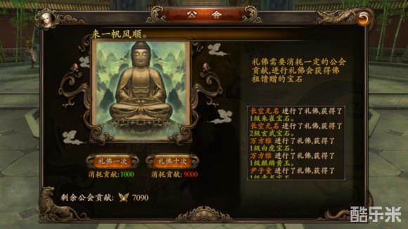 在公会礼佛中,礼佛一次消耗1000点贡献,礼佛10次消耗9000点贡献,每次礼佛完毕都会得到佛祖馈赠的宝石,宝石可是增加战斗力的关键因素哟。