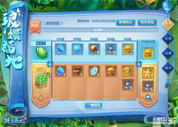 新服开启后,少侠可在琅嬛福地活动中领取每日任务、每周任务和一次性任务,完成后可获得琅嬛积分,升级福地等级,可获取大量奖励。解锁鸿运佩后,玩家还可获得更多稀有道具奖励,包括精灵之心、珍稀灵兽符文包、经脉道具暴血丹、快乐海星队标等,当福地满级后,还能使用积分兑换琅嬛商店中的道具,而活动截止后累计积分荣登排行榜的玩家还会获得排行榜奖励。