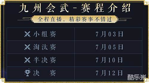 九州赛事活动时间为7月3日-7月12日,群侠齐聚,谁将携真金大奖满载而归?谁又将斩获九州会武全服至尊的冠军荣誉,我们拭目以待!