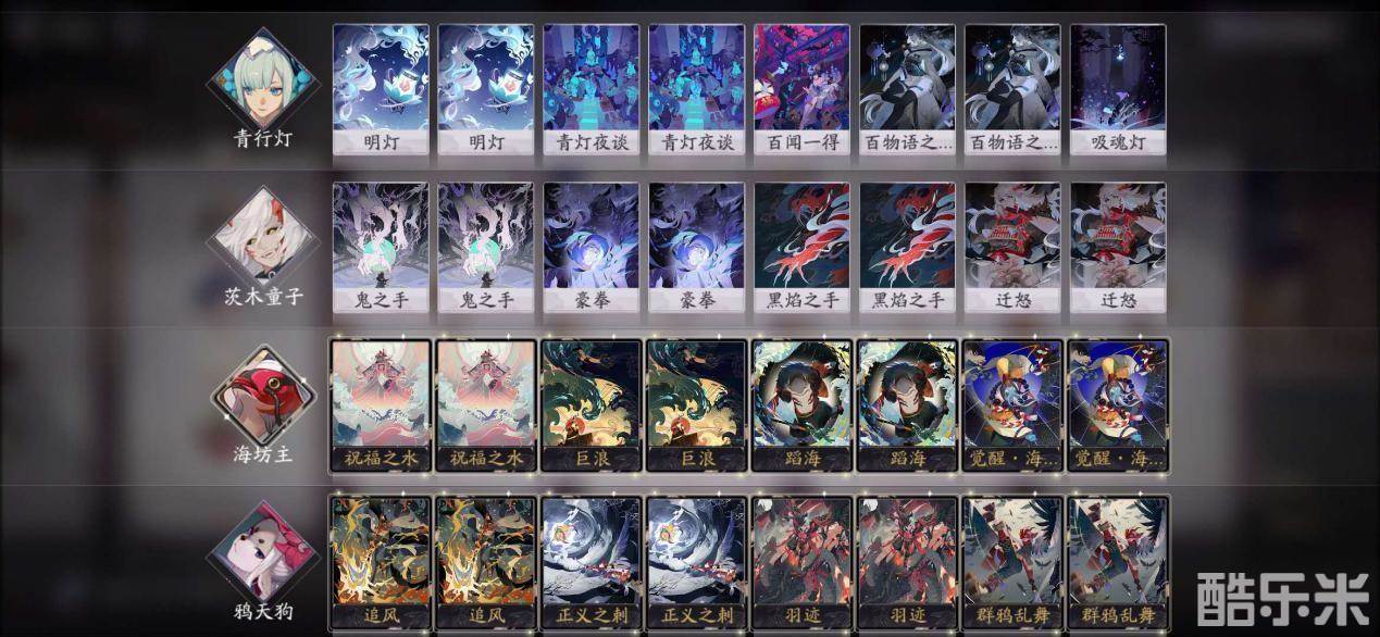 第二套卡组则是茨木童子与鸦天狗的搭档。这套卡组还携带青行灯与海坊主,让二勾玉二段之前的场面即可获得源源不断的鬼火资源。由此,茨木童子的“迁怒”、“黑焰”与“鬼之手”可以实现连击操作,配合鸦天狗的“正义之刺”也很好用。如果对方战斗区式神难以处理,玩家则可以使用鸦天狗的“羽迹”来拉出较弱式神,随后使用茨木连击,海坊主提供回复与加成效果。