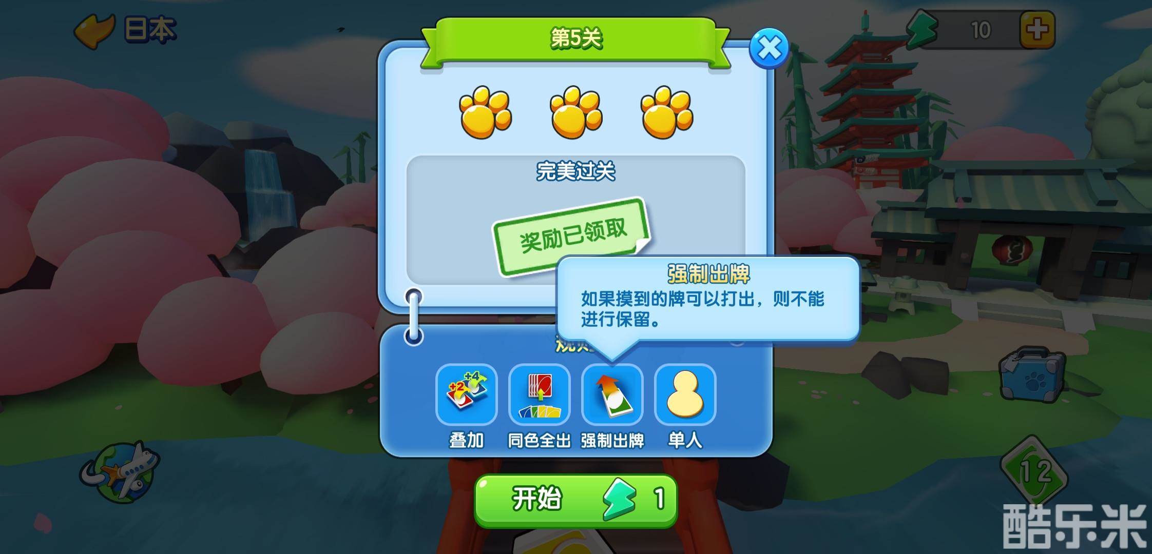 比如在日本剧情中的第1至3关的规则就是在叠加和同色全出的基础上增加了7-0换牌;而第4~8关则增加了强制出牌的规则,小伙伴们可别忘记哦~
