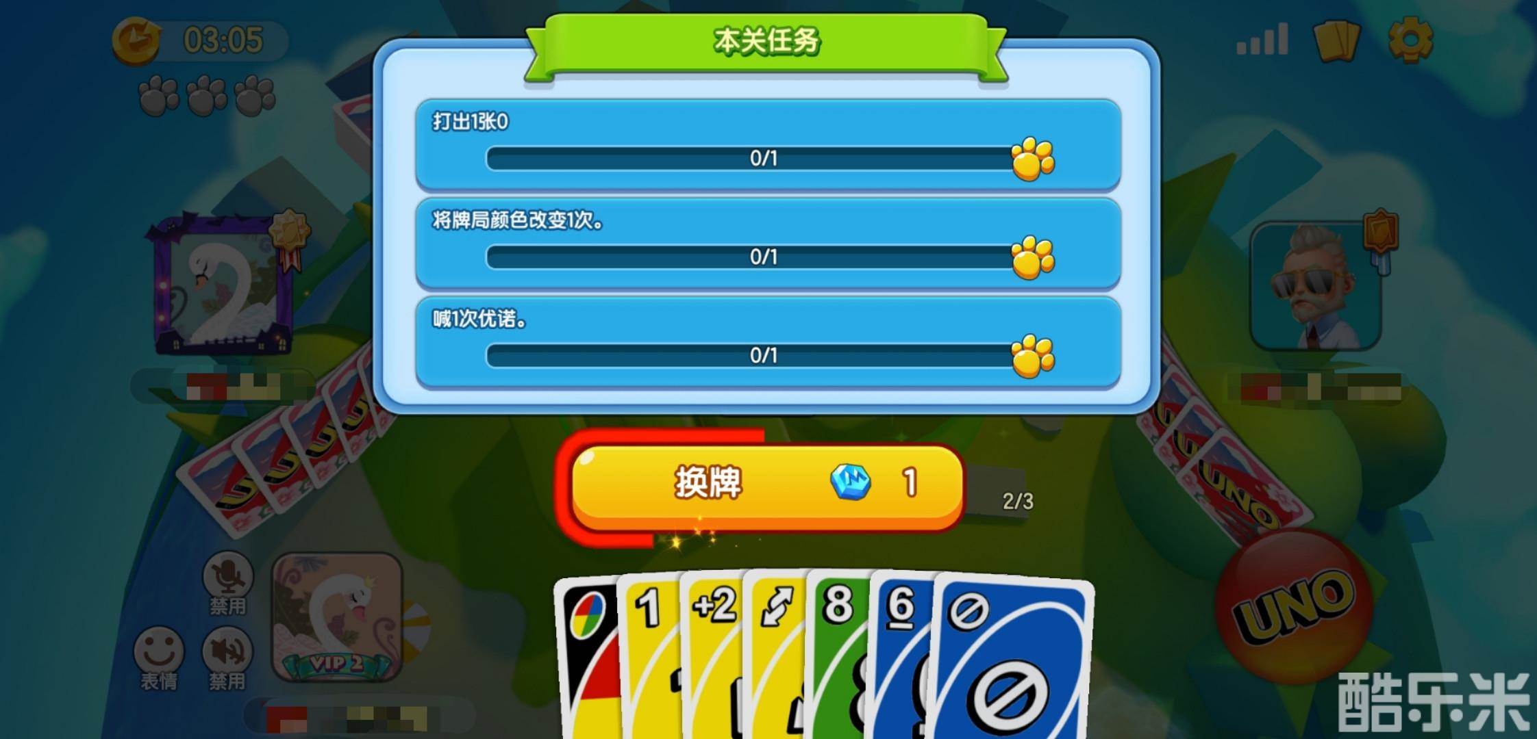 比如在一场对局中,通关条件之一是打出5张红色,但是UNO君手中没有红牌,此时就可以选择使用1个钻石换一下手中的牌啦。每场对局只有三次换牌的机会哦~