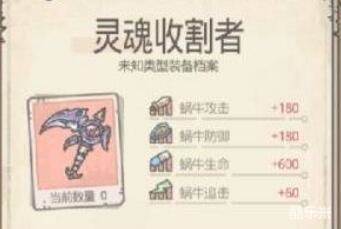 灵魂收割者的品质是红色的,装备的基础属性的加成是可以增加蜗牛150的攻击力和防御力,并且有600点的生命值。技能效果是当使用恶魔形态去探索的时候可以获得在增加12%的概率获得灵魂宝箱、并且还有额外的12%的恶魔细胞的获得。