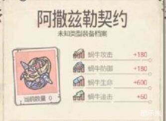 阿撒兹勒契约的品质是红色的,装备的基础属性的加成是可以增加蜗牛180的攻击力和防御力,并且有600点的生命值。技能效果是使用恶魔形态在战斗的时候可以增加12%的暴击率。