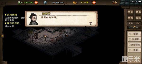 之后我们回到太白二楼继续洗澡,找牡丹花费十两调戏一下,继续回到太白楼二楼,剧情我们要等到子时去府衙巡逻打架。抓到黑衣人后等待审讯,师爷没有出来我们点击衙役进入地牢看剧情。