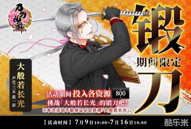 备受期待的人气刀剑男士「太刀·大般若长光」限时登场。7月9日至7月16日活动期间,审神者有机会通过锻刀功能获得「太刀·大般若长光」。