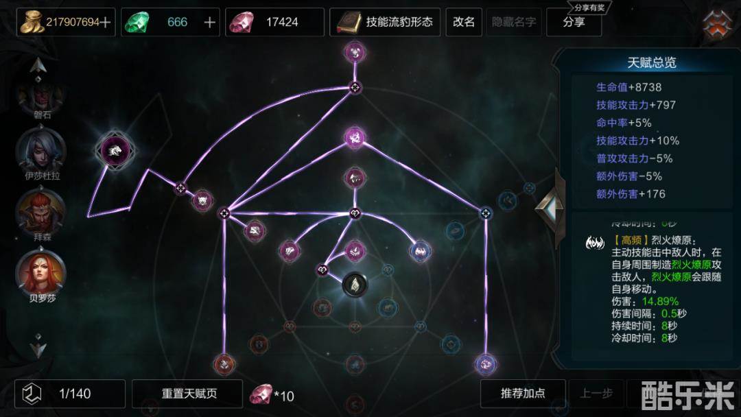 精准狩猎与赤炎光环两个天赋适合点亮。赤炎光环的触发条件是使用主动技能,虽然火女这个流派是普攻流,但她人形态下的技能没有修改为普攻类型,是可以触发这个天赋效果。