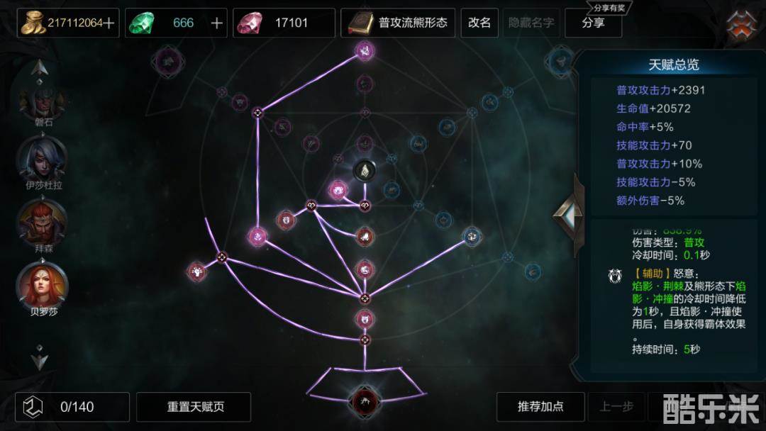 必选天赋:撼地巨熊、巨熊之灵、普攻专精、稳固姿态、火焰核心、怒意、赤焰光环