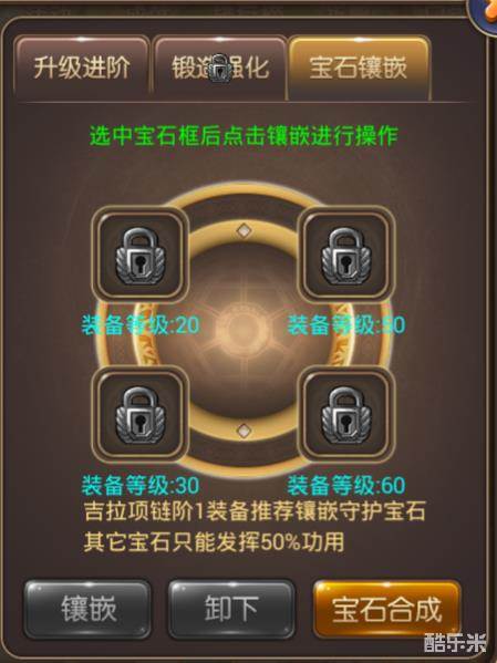 1.每一个装备进阶到20级以上才可以进行宝石镶嵌。