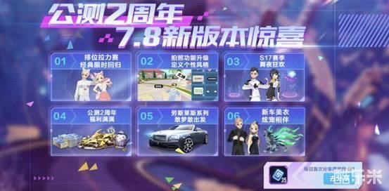 新版本上线,多种新版本福利即将开启!7月8日-7月13日,车手可在【游戏大厅】左上角点击公测2周年进入活动页面,每日首次分享新版本即可领取35点券!