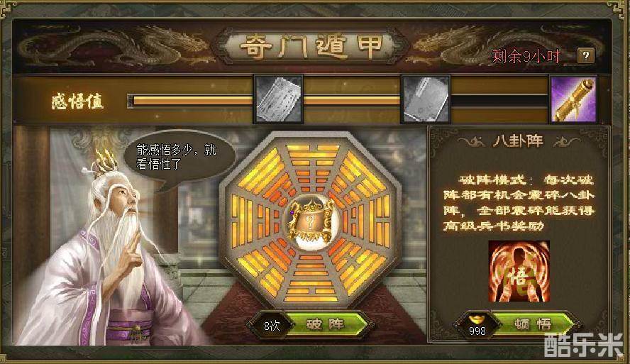 2、感悟环节共有8个阵法,每成功激活1个阵法,能额外获得1本兵书奖励;