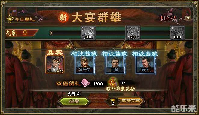 1、活动期间,可使用请帖或者盛宴邀请武将参加宴会,赴宴后可获得奖励;