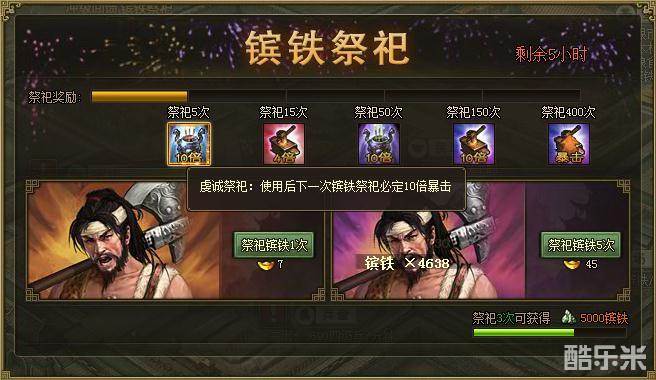 1. 每3次镔铁祭祀,可额外获得5000镔铁赠送;