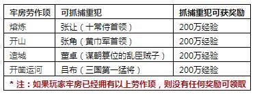 活动内容:活动期间,游戏内拥有牢房的玩家,达成以下牢房劳作项的开通,即可抓捕对应不同劳作的重犯,抓捕后即可获得丰厚经验。