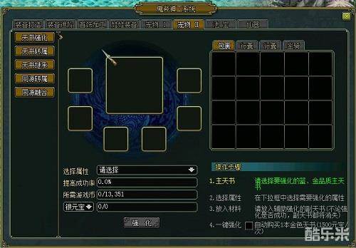 天书系统还可以在鬼斧神工宠物II页面中进行强化、继承和转换等操作。其中,等级大于100级且品质为蓝、金的天书可以对基础属性进行强化和提高,一次最多可放入6个辅助天书,且强化后辅助天书消失,而基础数值将得到一定程度的提高。另外,如果玩家对随机生成的基础属性不满意,则可以通过天书转属功能将不满意的属性替换,也就是天书转属操作。