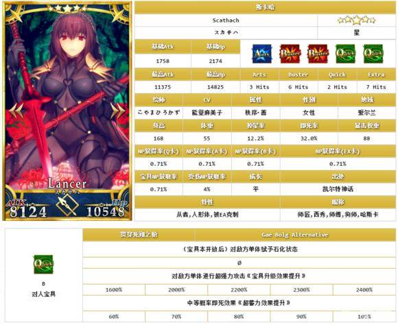 斯卡哈,师匠。当年限定的时候FGO荣登氪金榜榜首很久,卡面模型就非常吸引人了,战斗力也不差。1技能给予其当暴击队打手的能力,不过后期新出的某日天暴击太强了,师匠的暴击队就没那么流行了。师匠的强项在于3技能,神杀,打神性的BOSS额外100%伤害的特攻,对应BOSS如果是金闪闪,枪克弓是2倍伤害,神杀2倍伤害,低练度师匠都能一枪40W伤害秒杀。宝具一轮眩晕,用令咒可以连控3轮。
