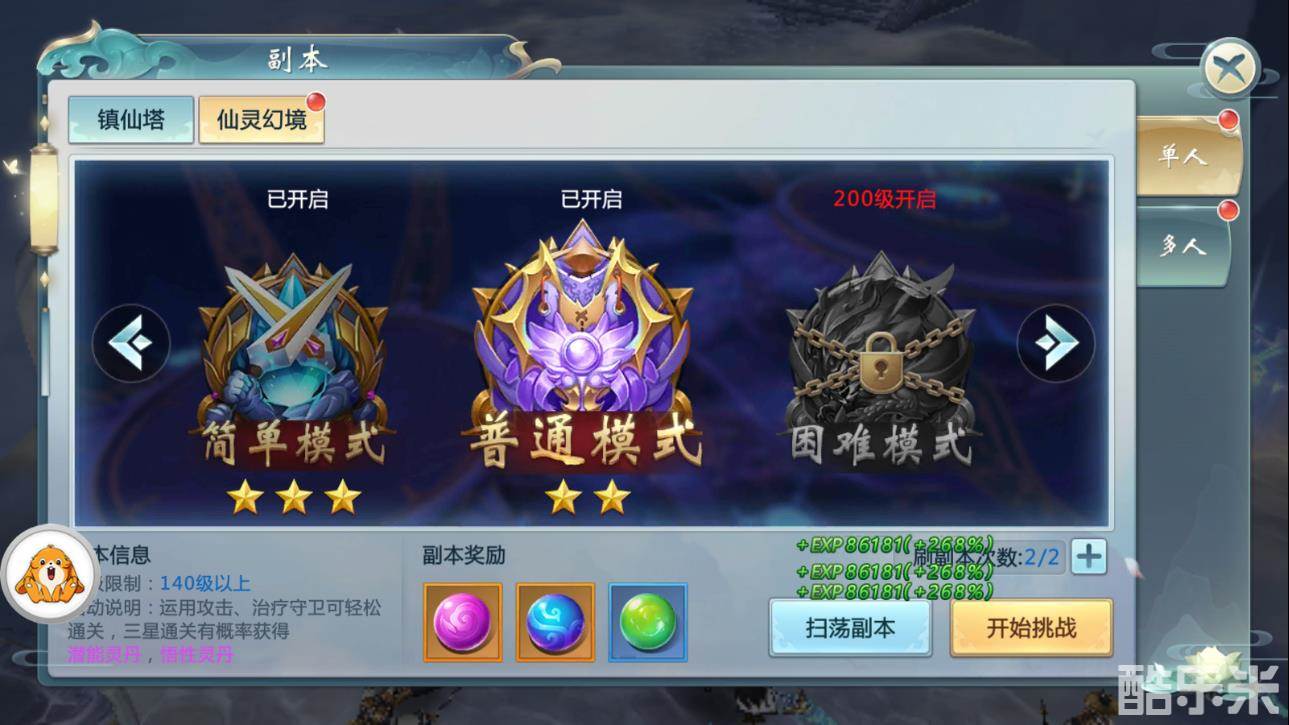 仙灵副本是免费获得宠物进阶丹的唯一途径。选择副本-仙灵副本(100级开放),打开副本界面。