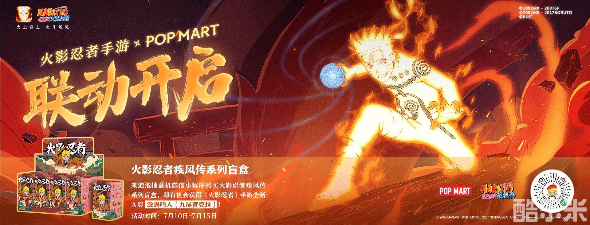 7月10日0点-7月15日期间前往“泡泡抽盒机”微信小程序购买火影忍者疾风传系列盲盒,必得《火影忍者》手游礼包,更有机会直接获得全新A忍漩涡鸣人「九尾查克拉」。