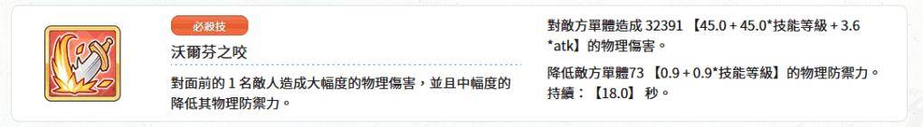 要了解狼姐的强,首先我们要了解这个游戏的伤害计算公式:伤害=攻击/(1+防御/100)。假设我们把敌方的防御力取100,那么这个时候我方角色打出的实际伤害就相当于被减半,当然这只是一个大概的约数,但实际误差不会很大。