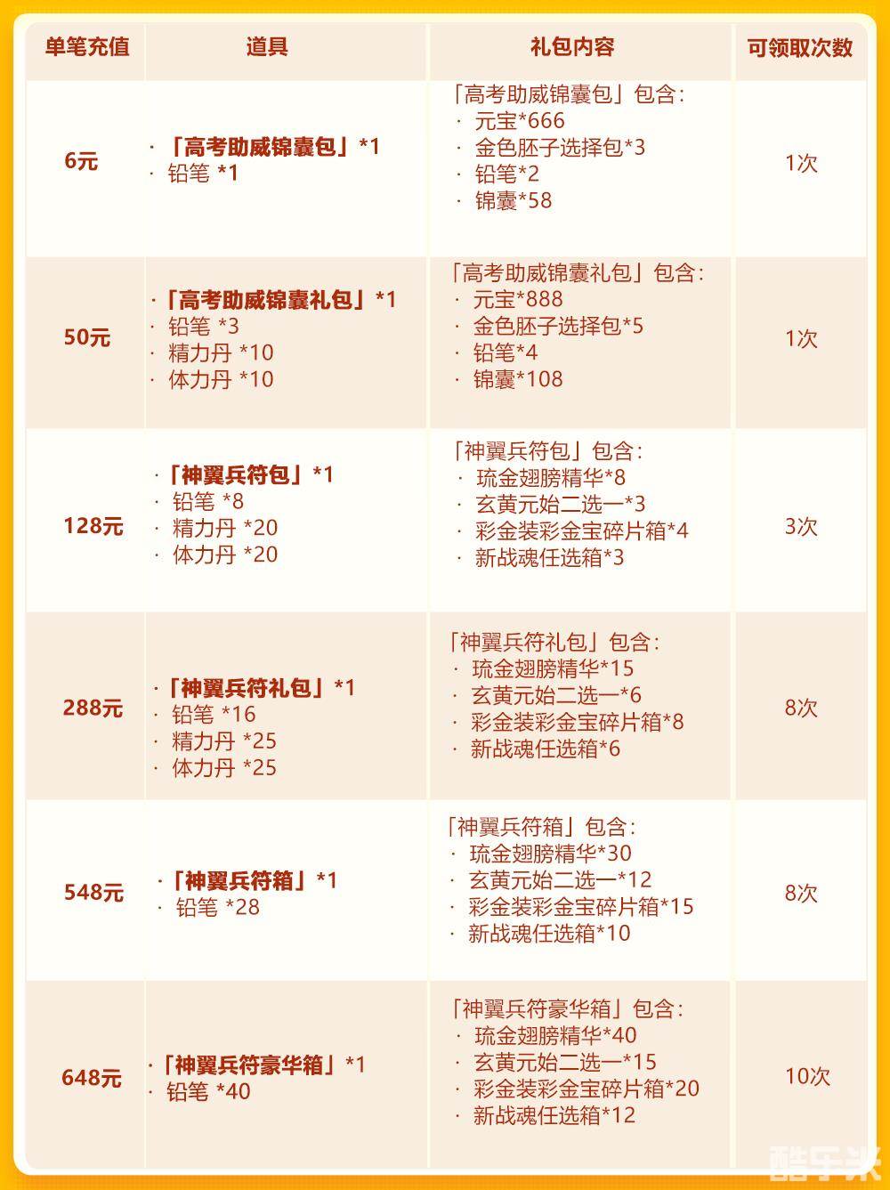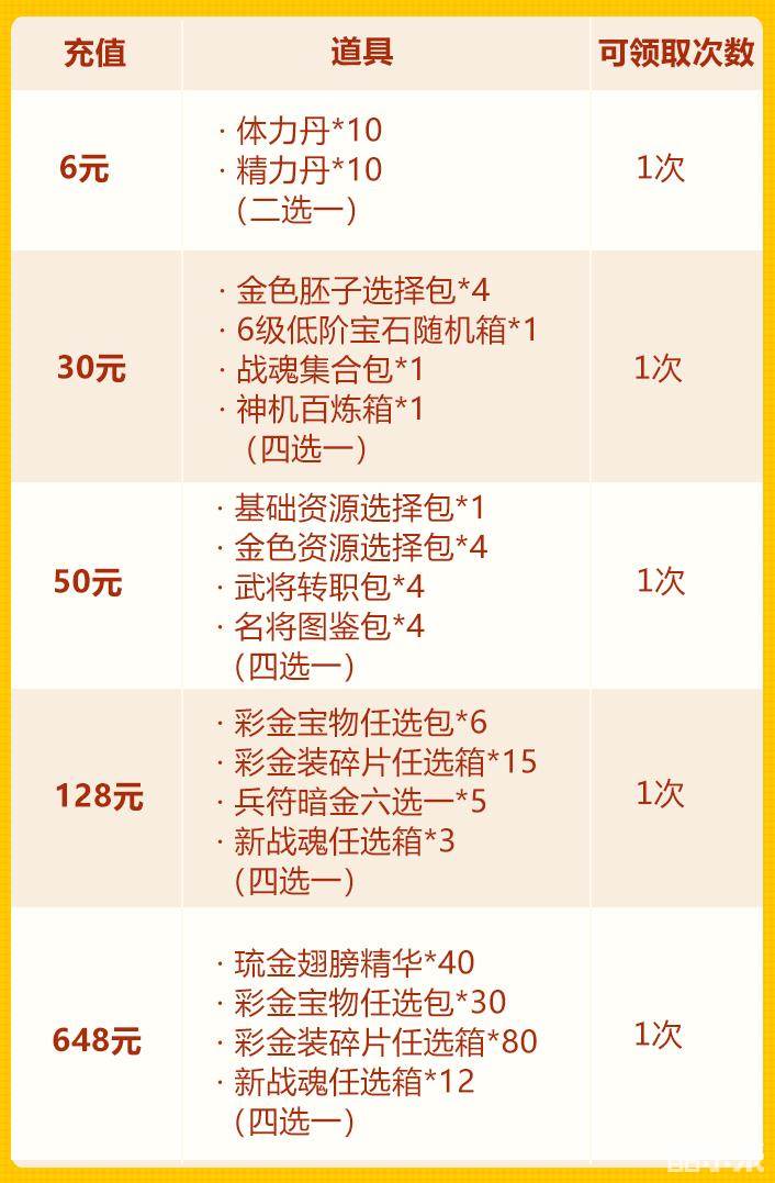 在活动期间少年们单笔充值至指定金额,即可获得琉金翅膀精华、玄黄元始二选一、彩金装彩金宝碎片箱、新战魂任选箱、铅笔等资源: